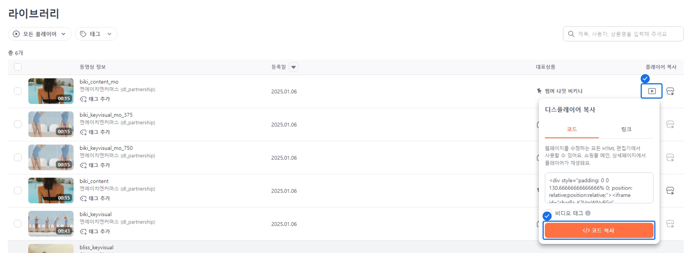 찰나 > 라이브러리에서 추가하려는 영상의 디스플레이어 코드를 복사해요.