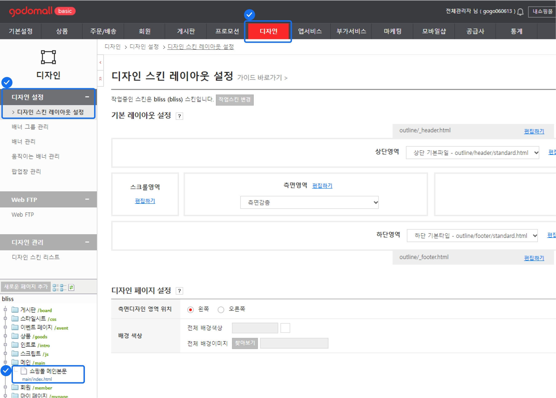 고도몰 어드민 > 디자인 > 디자인 설정 > 디자인 스킨 레이아웃 설정 페이지에 접속해요.
