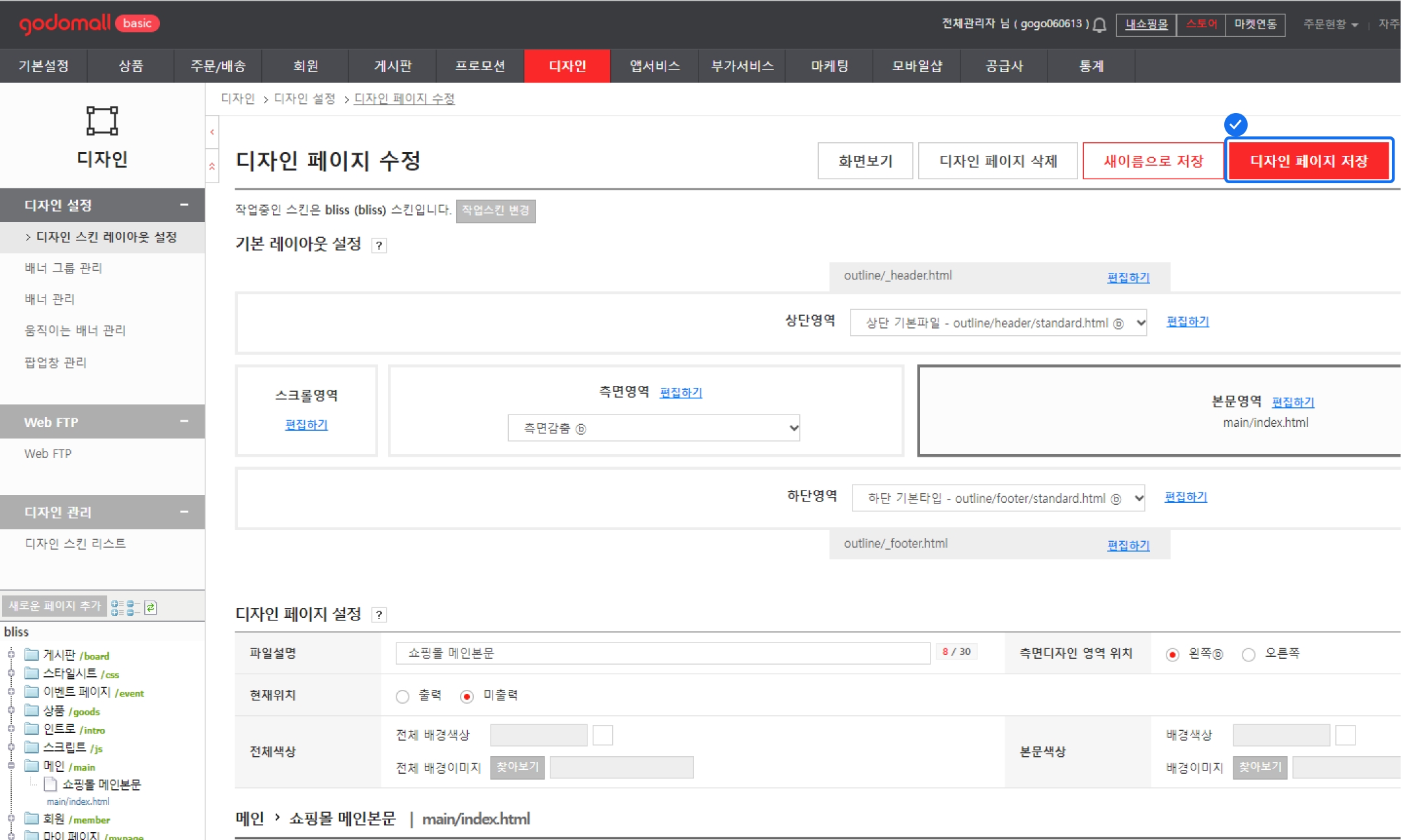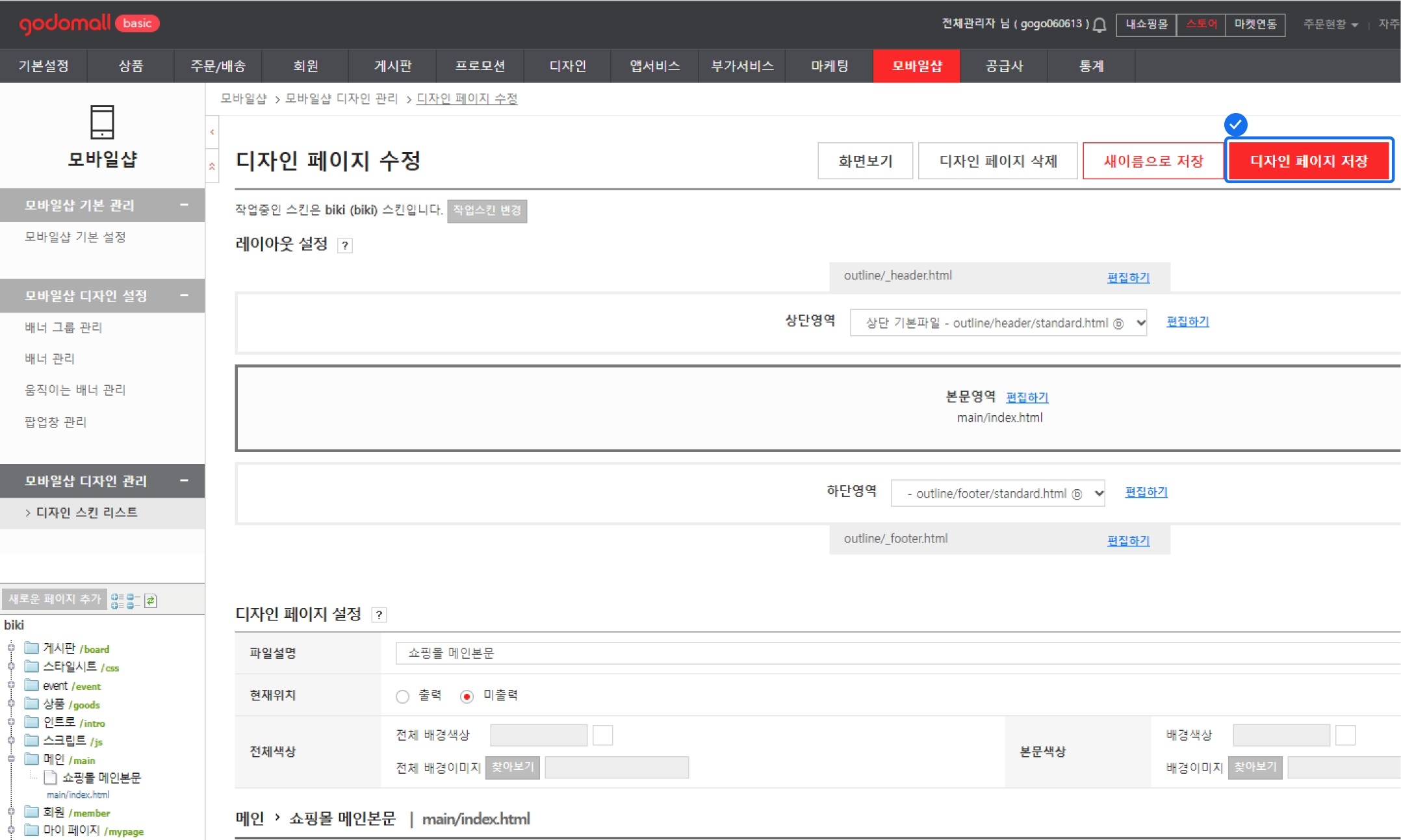 코드 수정 후 [디자인 페이지 저장] 버튼을 클릭해요.
