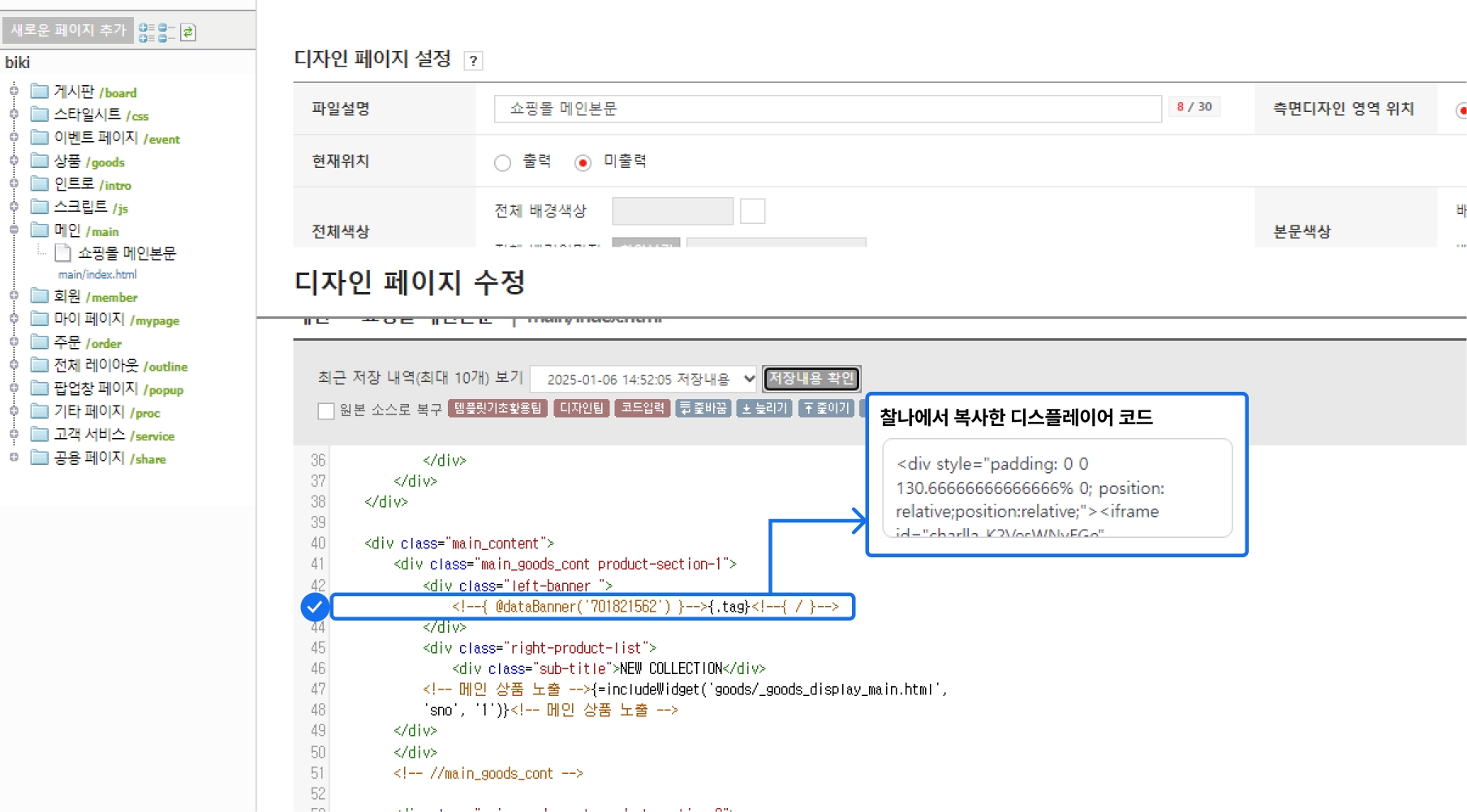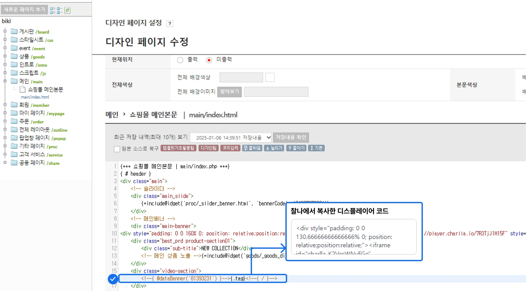 메인 본문 '<div class="main_visual">' 내용을 찰나에서 복사한 디스플레이어 코드로 수정해요.