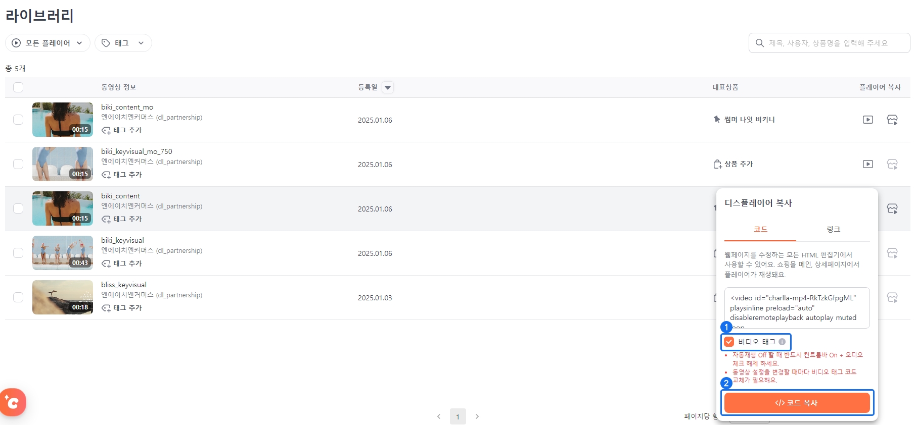 추가하려는 영상의 디스플레이어 코드에서 '비디오 태그' 옵션을 선택 후 복사해요.