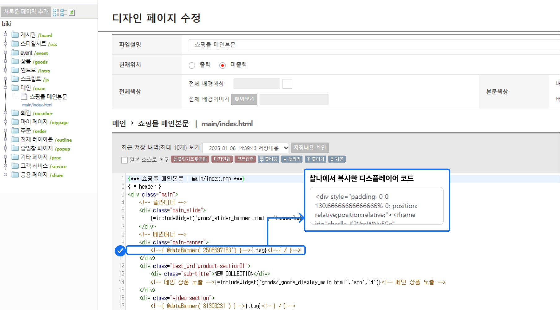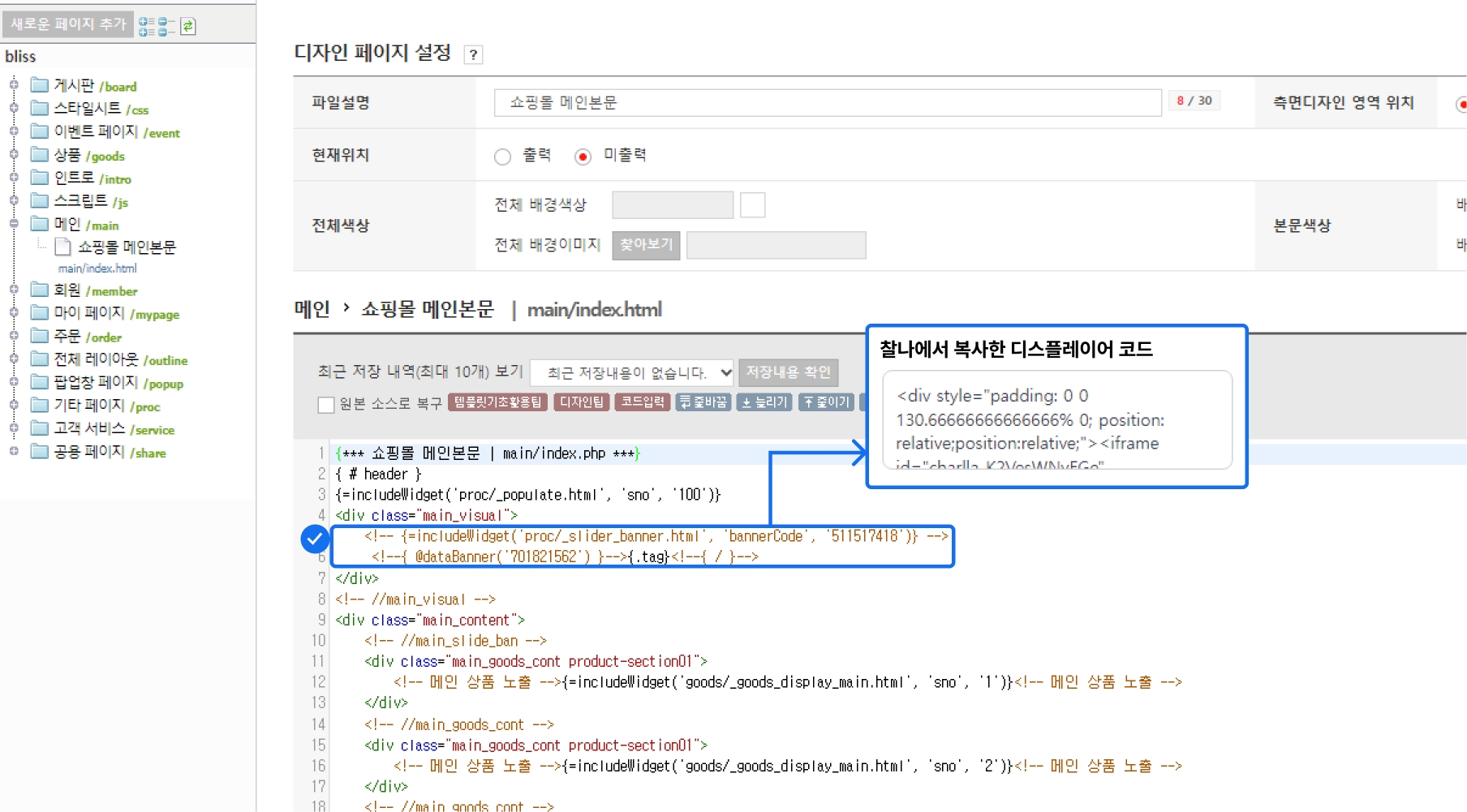 메인 본문 '<div class="main_visual">' 내용을 찰나에서 복사한 디스플레이어 코드로 수정해요.