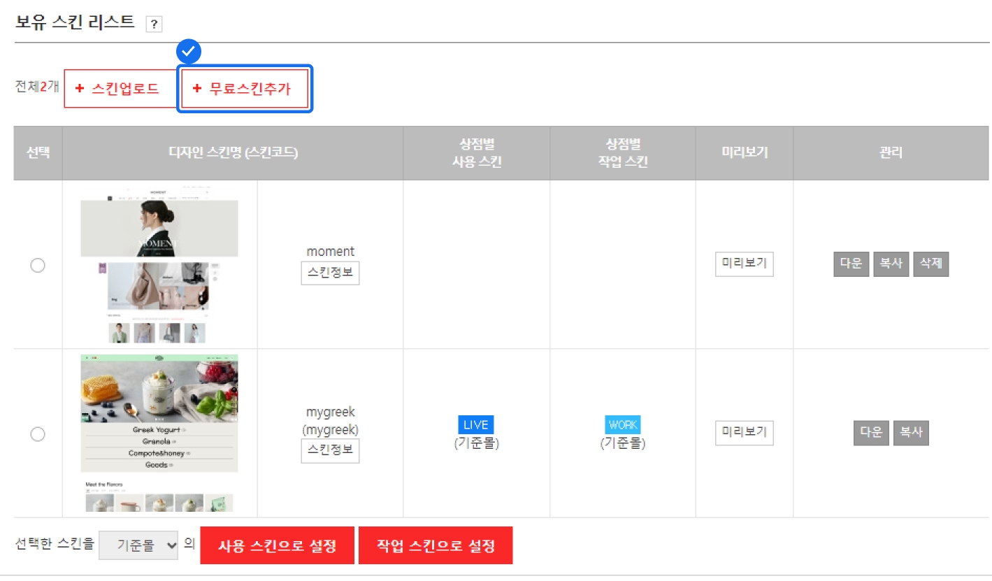 해당 스킨을 내 쇼핑몰 스킨으로 설정하고 싶다면 스킨 선택 후 [사용 스킨으로 설정] 버튼을 클릭해요.