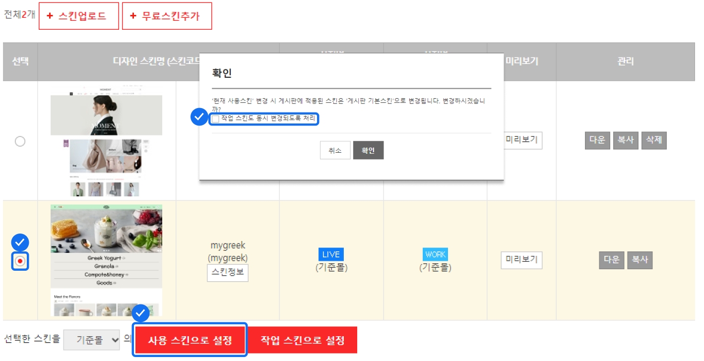 작업 스킨도 동시 변경되도록 처리를 선택 후 [확인]을 클릭해야 어드민 설정 내용이 내 쇼핑몰에 정상 적용돼요.