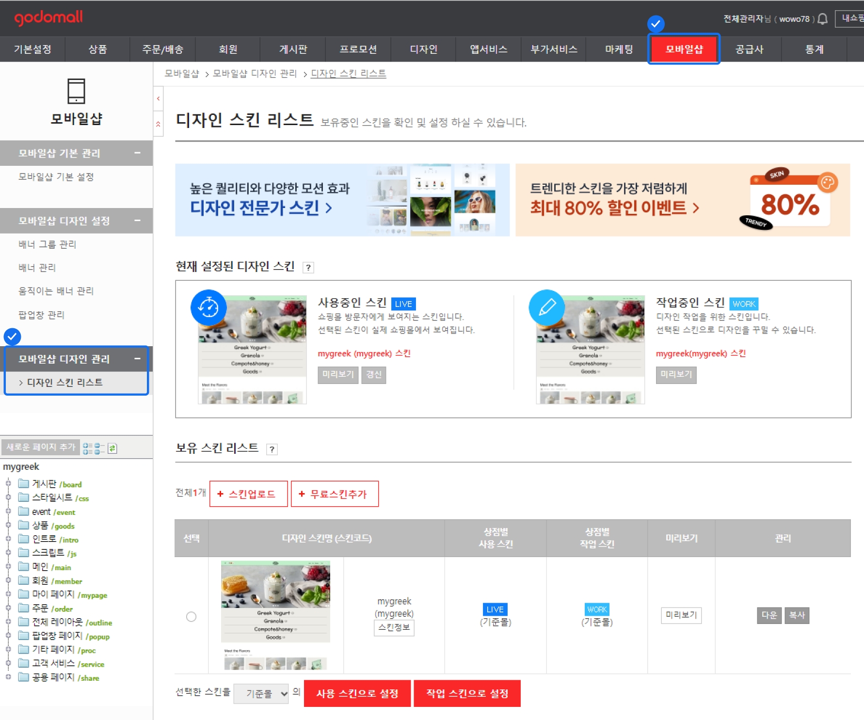 모바일 스킨은 [어드민 > 모바일 샵 > 디자인 관리 > 디자인 스킨 리스트]에서 확인할 수 있어요.