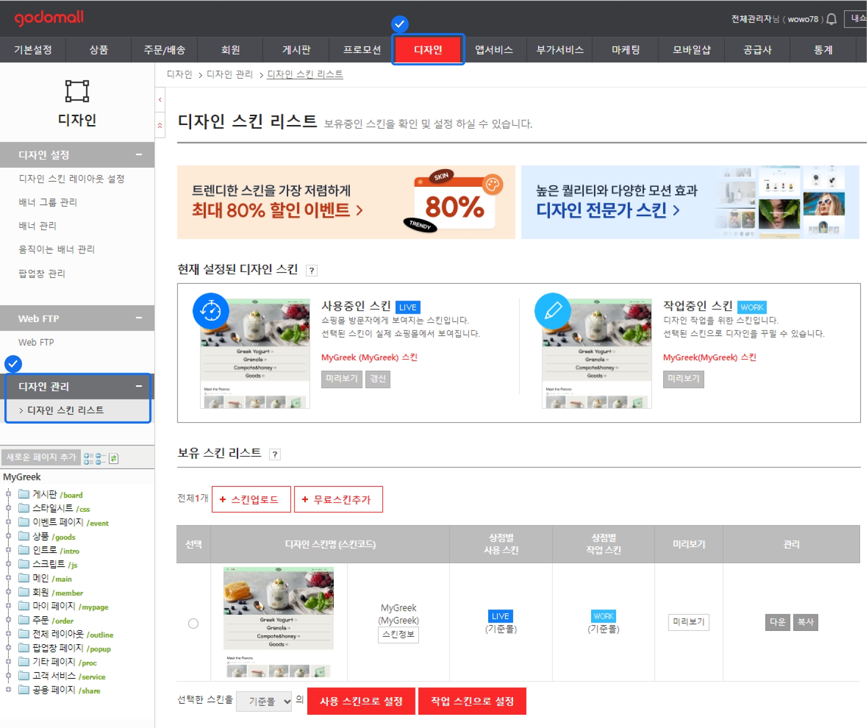 PC 스킨은 [어드민 > 디자인 > 디자인 관리 > 디자인 스킨 리스트] 메뉴에서 확인할 수 있어요.