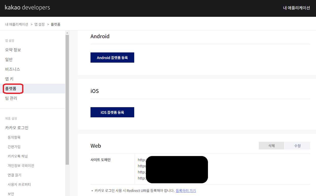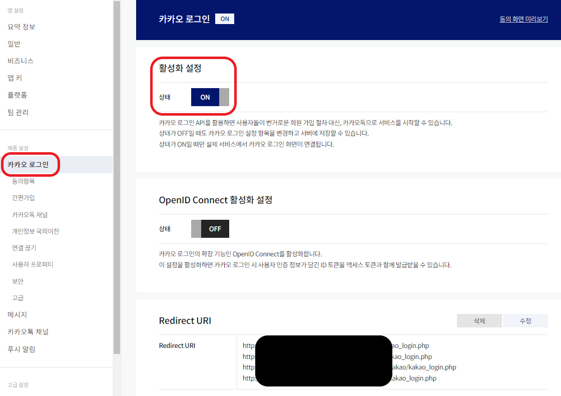 위의 페이지에서 고도몰과 연결된 카카오 계정이라는 것이 확인되었다면 redirect URI의 등록 상태를 확인합니다.