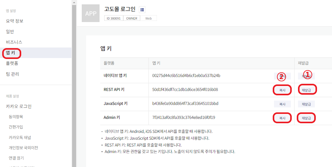 내용을 정상적으로 수정하셨다면 앱키 메뉴로 접속하여 REST API 키, Admin 키 를 재발급한 뒤에 복사해서 고도몰 관리자 페이지에 등록합니다.