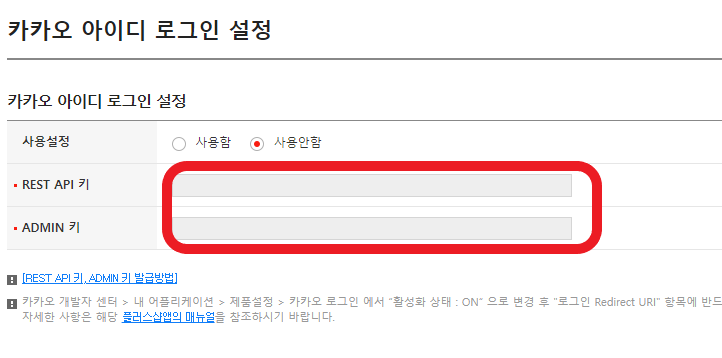 REST API 키, Admin 키 를 복사해서 고도몰 관리자 페이지에 등록합니다.