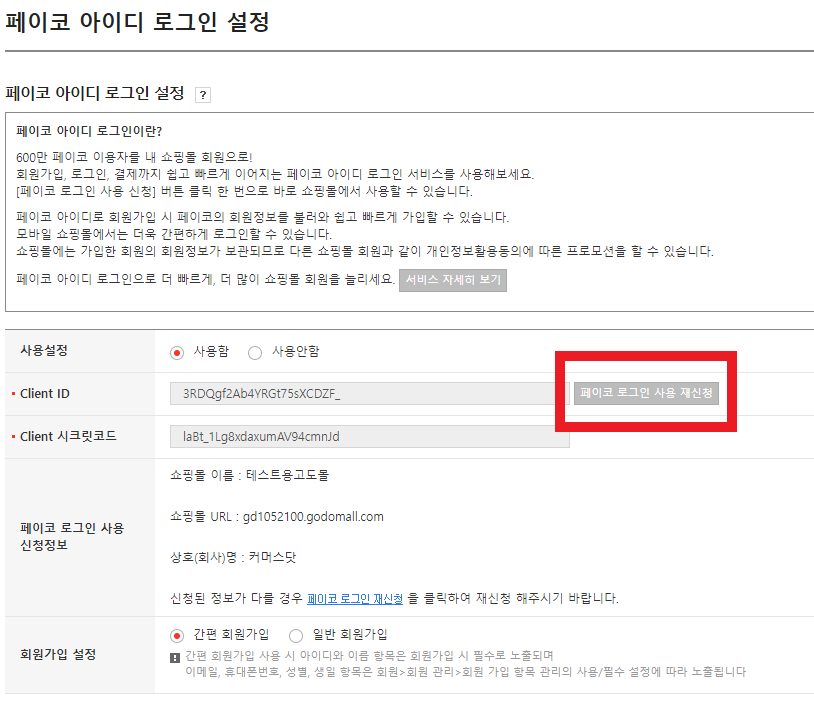 이 부작용을 감수하고서라도 클라이언트 아이디 변경을 원하신다면 페이코 로그인 사용 재신청 버튼을 통해서 페이코 클라이언트 아이디를 변경하실 수 있습니다.